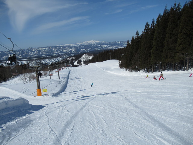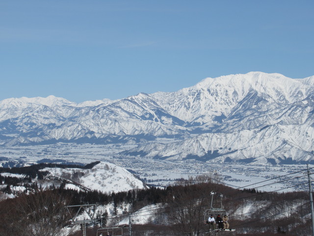 午後は当間ゲレンデの各コースを滑りパノラマゲレンデへ戻ってきました。連絡リフトと連絡リフトの間がわずかな距離ですが平らだったり、登ったりだったので、初心者の人はちょっと辛いと思います。 | ![]() 八海山方面 |