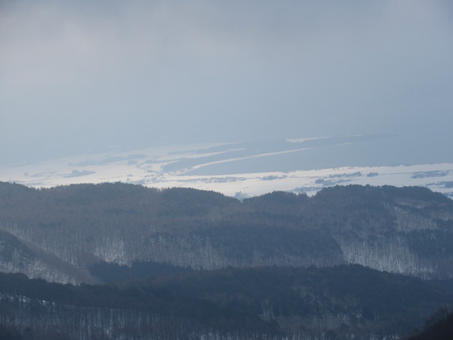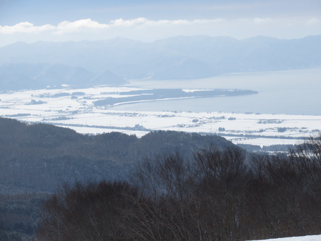 遠くに猪苗代湖が見えたので撮影してみました。天気は回復傾向ですがまだよくありません。今日は南エリアを滑ります。 |