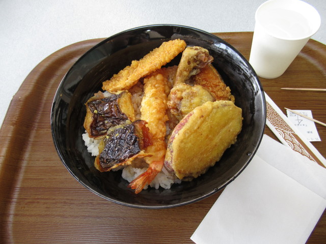 駐車場に着くと結構混んでいて、ゲレンデまではちょっと遠い場所でした。準備をしてリフト券を購入し「さてリフトで上へ」というときに乗ろうとしたリフトが故障点検中ということで、混んでいるゴンドラへ。 | ![]() お昼の天丼 |