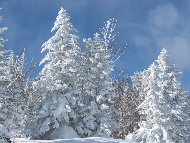 午後は第1高速リフトで「A-2」コースを滑り、ゴンドラで上へ。滑っていないコースを滑り休憩です。 | ![]() 蔵王にはかなわない樹氷 |