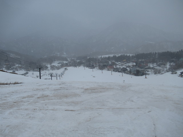天気はあまりよくなく、ちょっと降っています。が、スキーには雪が必要なので我慢です。 | ![]() 第6ペアリフトを降りた所 |