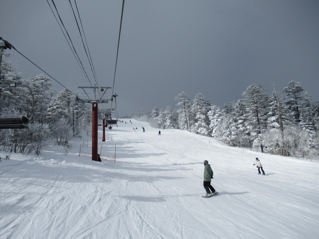 雪は午前中は良かったですが、午後は少し滑りにくい雪になってきました。 | ![]() クワッドリフトの込み具合 |